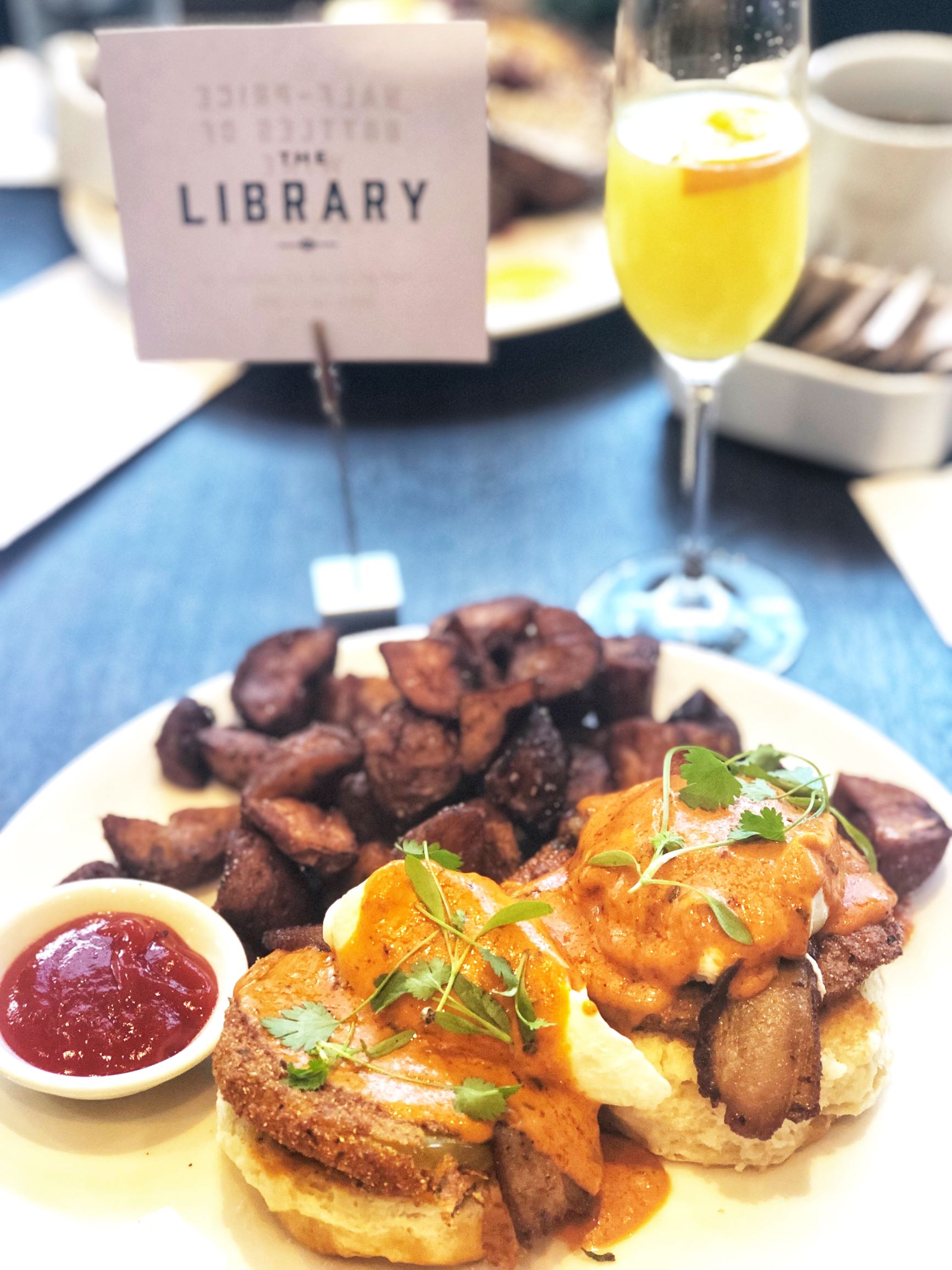 Oigan! One of my favorite things in the whole wide world is BRUNCH! In my opinion, there isn’t a better meal of the day. Especially if you pair it with some mimosas, a sundress, and a few amigas. Brunch anywhere is nice, but brunch at The Library in St. Pete… that’s a by-god TREAT! First of all, es una belleza de lugar, it’s just a gorgeous place. The design is of a “library” (huge shock, I know) inspired by the George Peabody Library collection, but think “refined library” with loads of natural light, modern fixtures, parquet floors, and bookshelves filled with delightful, old books! It’s a vibe. The food rises up to meet the high expectations that the decor creates; just yummy. Pictured is the superb dish that I had on my last brunch date con las chicas. It’s called: “Benedict”. This brunch plate has pork belly, poached eggs, fried green tomatoes, and creole fondue on a warm biscuit. Is your mouth watering yet?